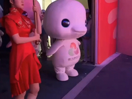 在构思时,曾振伟聚焦在吉祥物喜洋洋、乐融融的双眼,感觉它们的眼睛特别有神,仿佛在和自己互动交流,随即决定把海豚的脸谱放大。
