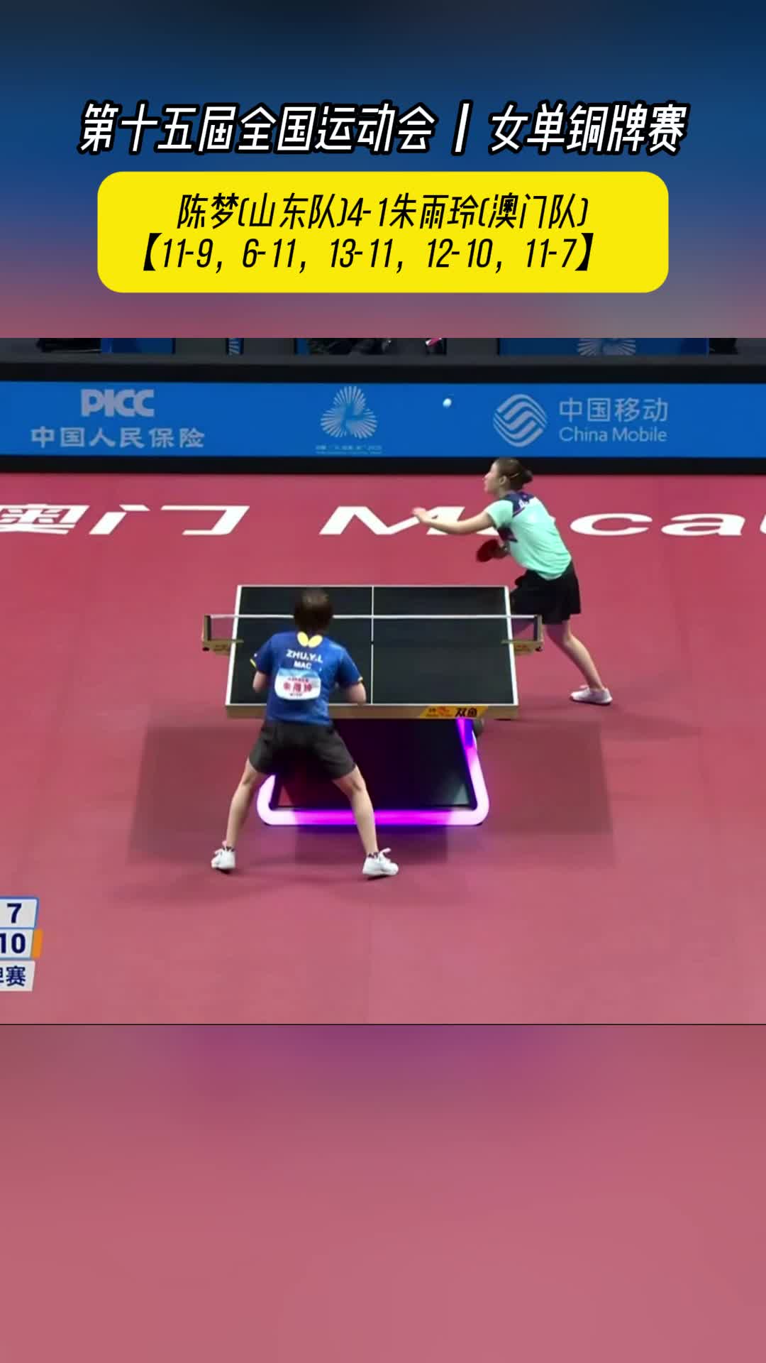 11月16日,第十五届全国运动会女子单打铜牌赛在澳门银河综艺馆举行,两员老将朱雨玲和陈梦上演了一出精彩的对决,最终陈梦4比1胜出,获得该项目的铜牌。