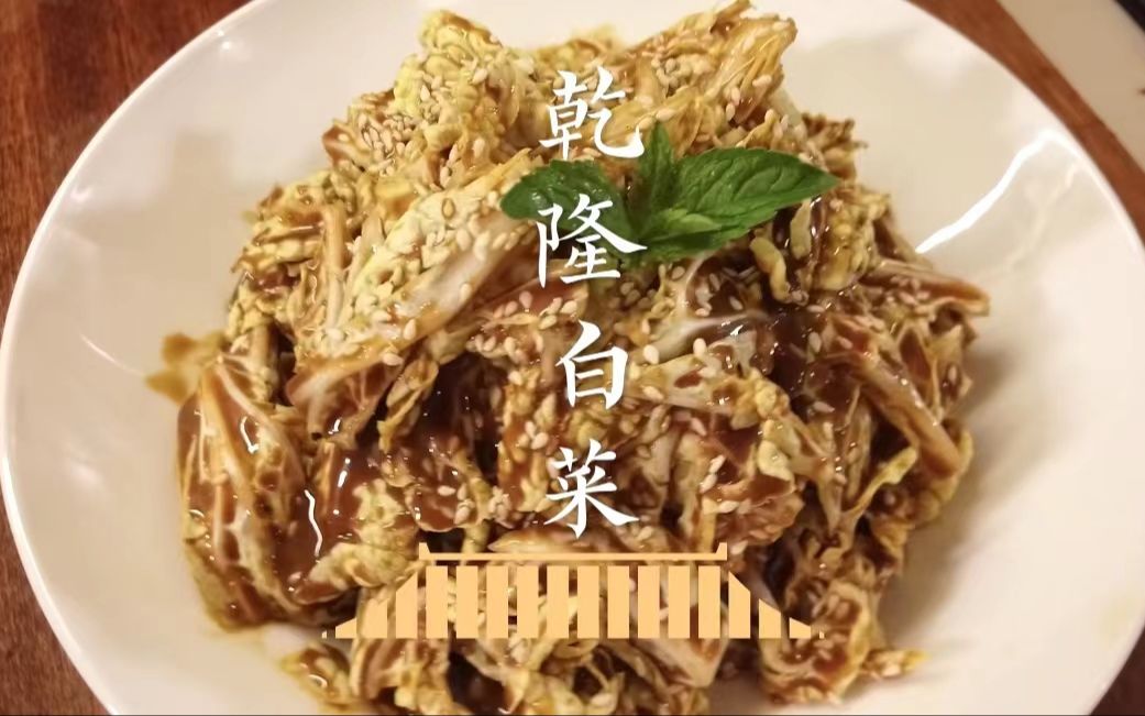 乾隆白菜,其实就是一碟凉拌白菜,主料是嫩白菜芯儿,撕成片儿,用芝麻酱,加白糖、蜂蜜、香醋调好一拌,撒点儿白芝麻,就这么吃。